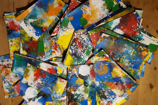 Bisher hat sich mir die Frage „Wie schwer ist eigentlich Farbe?“ nur in dem Zusammenhang der Farbgewichtung in einem Bild gestellt, gibt es also z.B. zu viel Rot im Verhältnis zum eingesetzten Blau. Heute, beim Zusammenstellen der Einladungsbriefe, hat die Thematik einen ganz anderen, einen ursprünglicheren Ansatz gefunden. Beim Eintüten fiel mir auf, dass die Blätter, die ich für die Mitmach-Aktion vielen Einladungen beigebe, durchaus unterschiedlich schwer sind. Das hängt davon ab, wie viel (Acryl-)Farbe sie bei der Décalcomanie (Abklatschverfahren) abbekommen haben. Zusammen mit dem schweren Aquarellpapier…